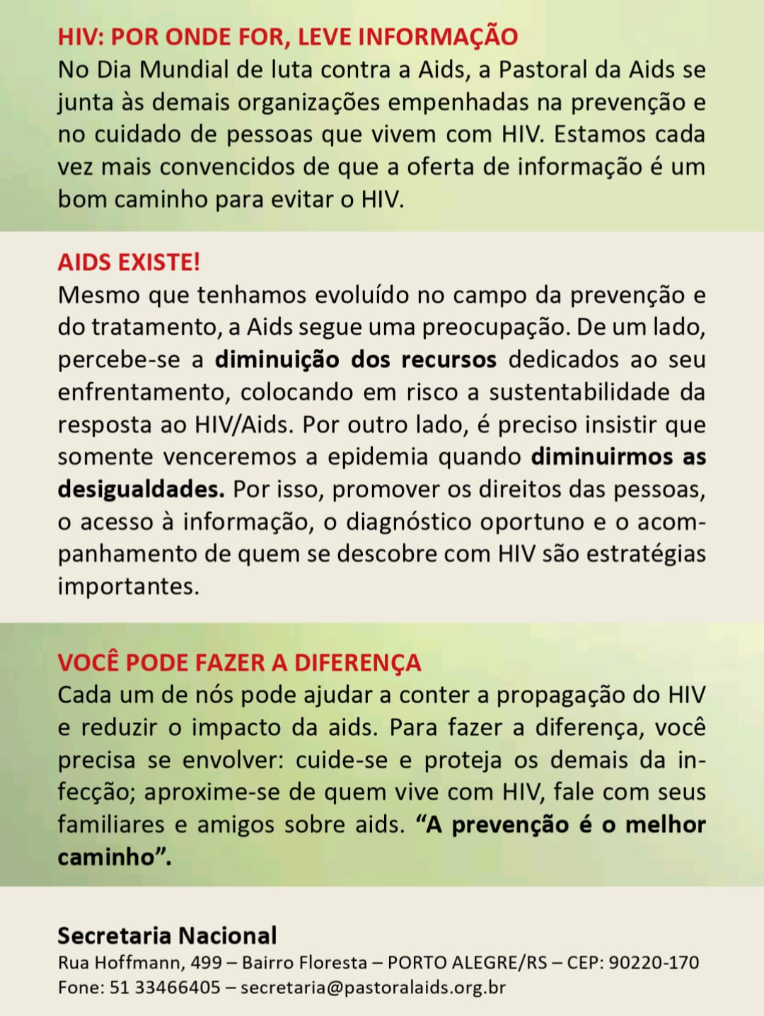A mensagem da Pastoral recorda ainda que “Aids existe!” e que só será possível vencer essa epidemia quando forem reduzidas as desigualdades que dificultam o acesso à prevenção, ao diagnóstico oportuno e ao acompanhamento adequado. Promover direitos, garantir informação e acolher quem recebe o diagnóstico são atitudes profundamente cristãs.